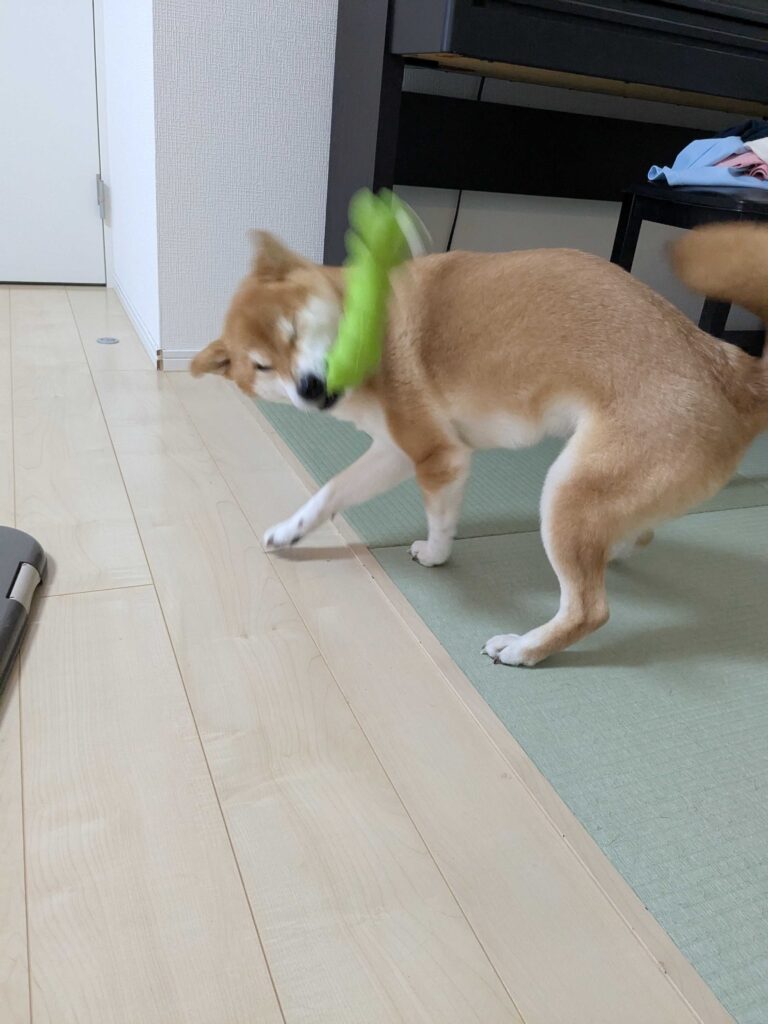 正直、Amazonで買った数千円のタフなおもちゃより食いつきがいい。 「これ、100円だよ?」と語りかけても、あめは聞く耳持たず。ブンブン振り回して、鼻先で突っついて、もう野生の血が騒ぎまくり。