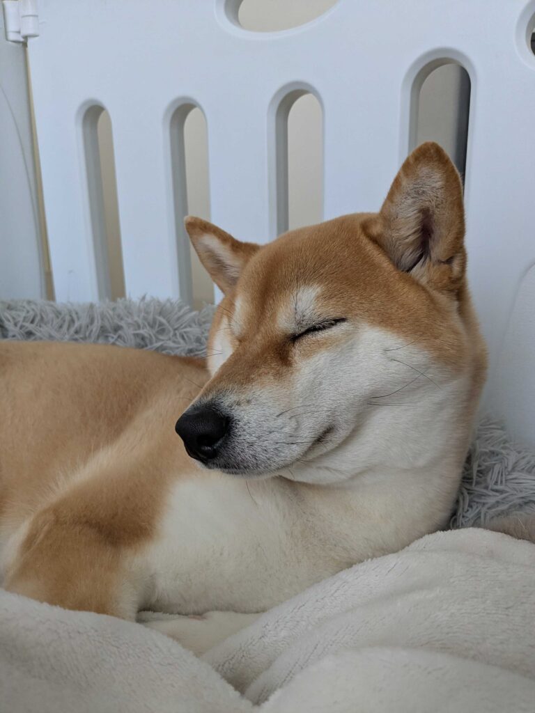 朝起きると必ずそこにいて、夕方帰ってきても同じ場所でぐーすか寝てる。「あめ、そんなに気に入ったの?」って話しかけると、目だけ半開きにして尻尾をぱたぱた。その顔がもう、幸せそうで幸せそうで……思わず写真を撮りました(笑)